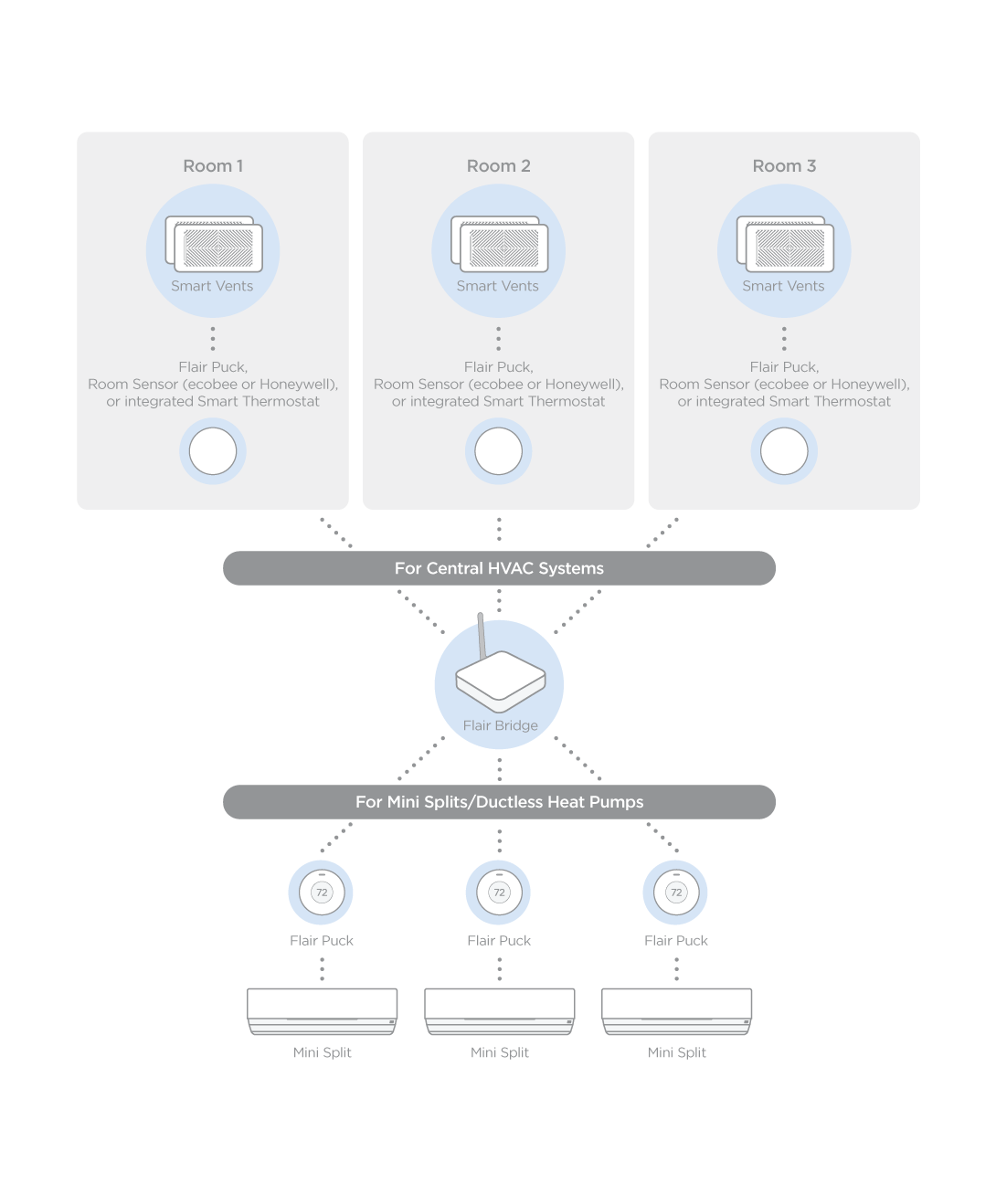 Every Flair home using Smart Vents requires a Bridge to serve as the central networking device. A centrally located Bridge covers ~4,000 sq ft homes. Layout and building materials impact range. Additional Bridges can be added to increase range.