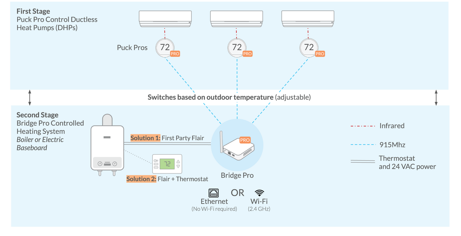 For Solution 1 (recommended), the Flair Bridge Pro directly manages the second-stage heating providing seamless, full first-party staged heating.
