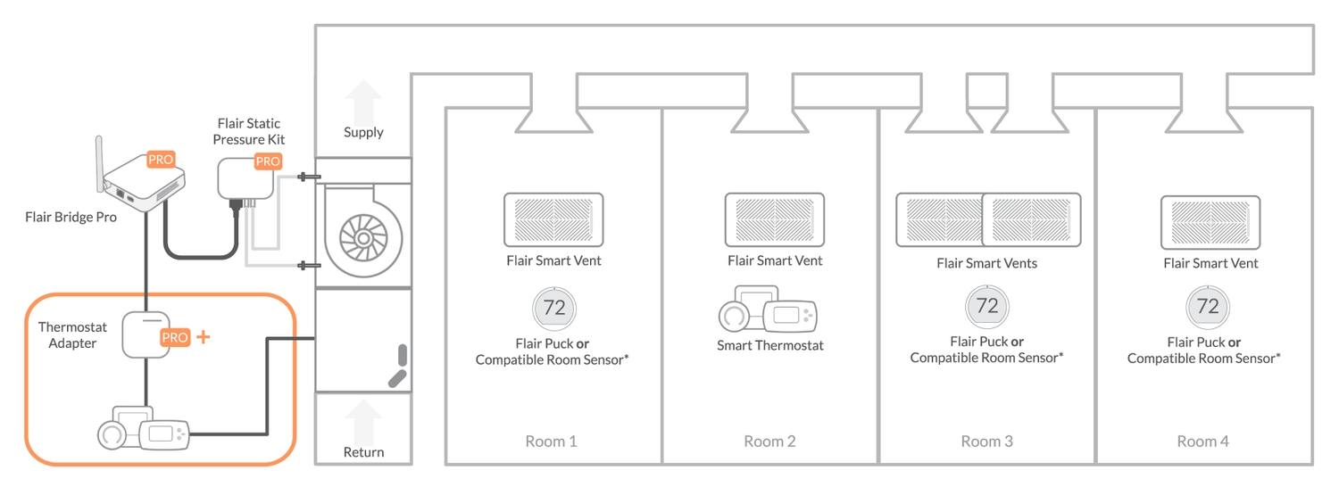 Pro Level Zoning and Air Balancing systems combine the Bridge Pro, Static Pressure Kit and Smart Vents managed by the Flair application to manage airflow throughout a home. The Flair Pro+ system enables multi speed fan control with compatible HVAC equipment through a thermostat adapter.